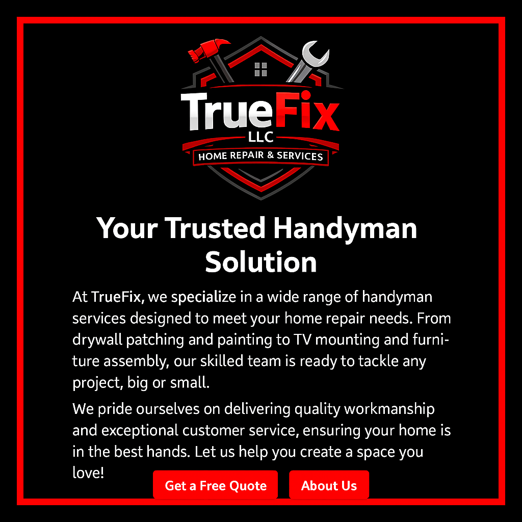 At TrueFix, we specialize in a wide range of handyman services designed to meet your home repair needs. From drywall patching and painting to TV mounting and furniture assembly, our skilled team is ready to tackle any project, big or small. We pride ourselves on delivering quality workmanship and exceptional customer service, ensuring your home is in the best hands. Let us help you create a space you love!